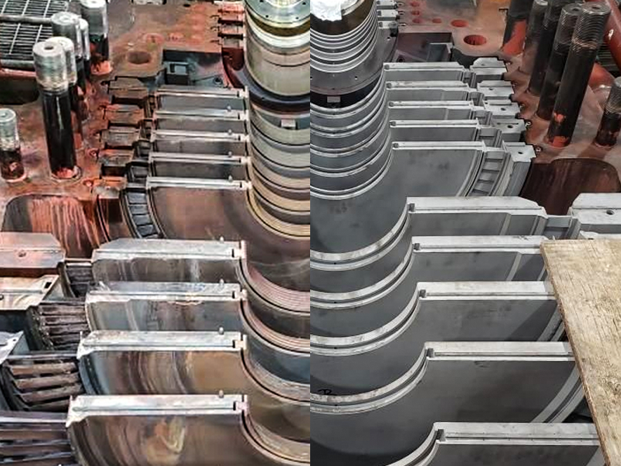 Our findings clearly indicated that a major inspection was warranted. The L/H diaphragms were removed from the unit, and the rotor, U/H case with diaphragms, and valve rack were all shipped to the Conhagen CA shop for inspections and repairs. The rotors and diaphragms were blast-cleaned and inspected. No significant issues were found beyond some areas of minor damage. The inlet side wheel transition radii of stg #7 & #8 were found to have erosion/undercutting. Conhagen smoothed and machined the radii removing the sharp edges/corners. Standard strap polishing of the remainder of the shaft areas was completed during this process.